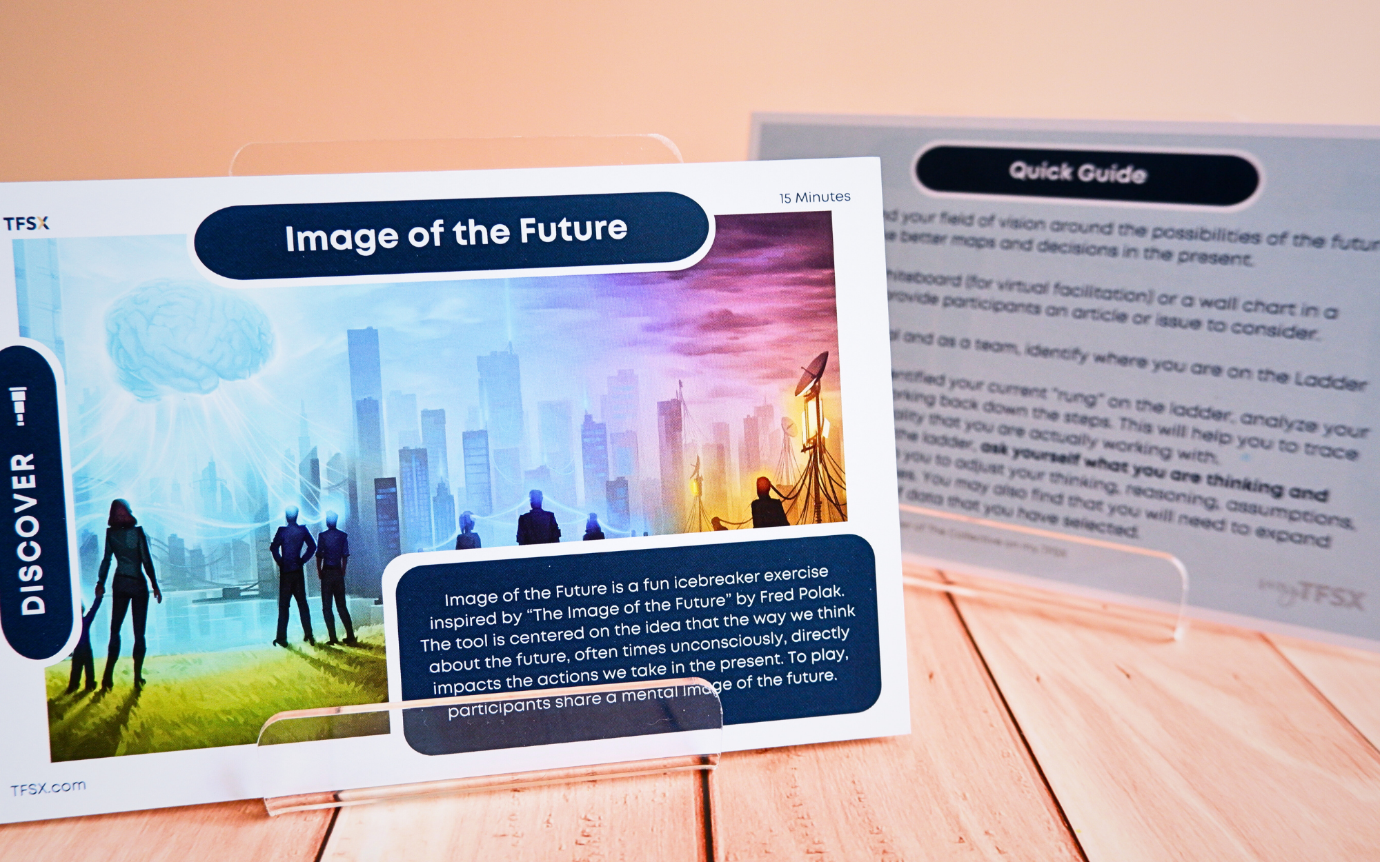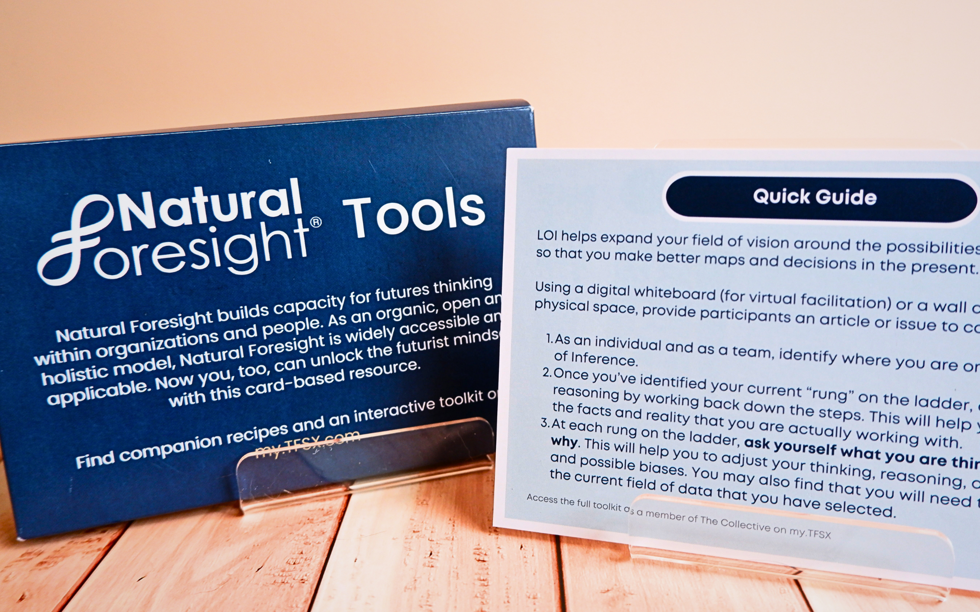 Natural Foresight tools are mental frameworks, discussion prompts, and creative practices that can be applied personally or in groups. Cards boost staff meetings, strategic planning sessions, online workshops, or even meditations to consider future implications of everyday decisions.Use the tools individually or in limitless combinations to spark creativity, deepen insights, and guide transformative conversations. Want to take it further? Pair the deck with a my.TFSX membership to unlock curated workshop recipes, downloadable templates, and exclusive resources that turn inspiration into action. While TFSX owns and retains Natural Foresight Framework® copyright and trademark, we encourage use of the materials as they are, or in modified form with the following attribution: